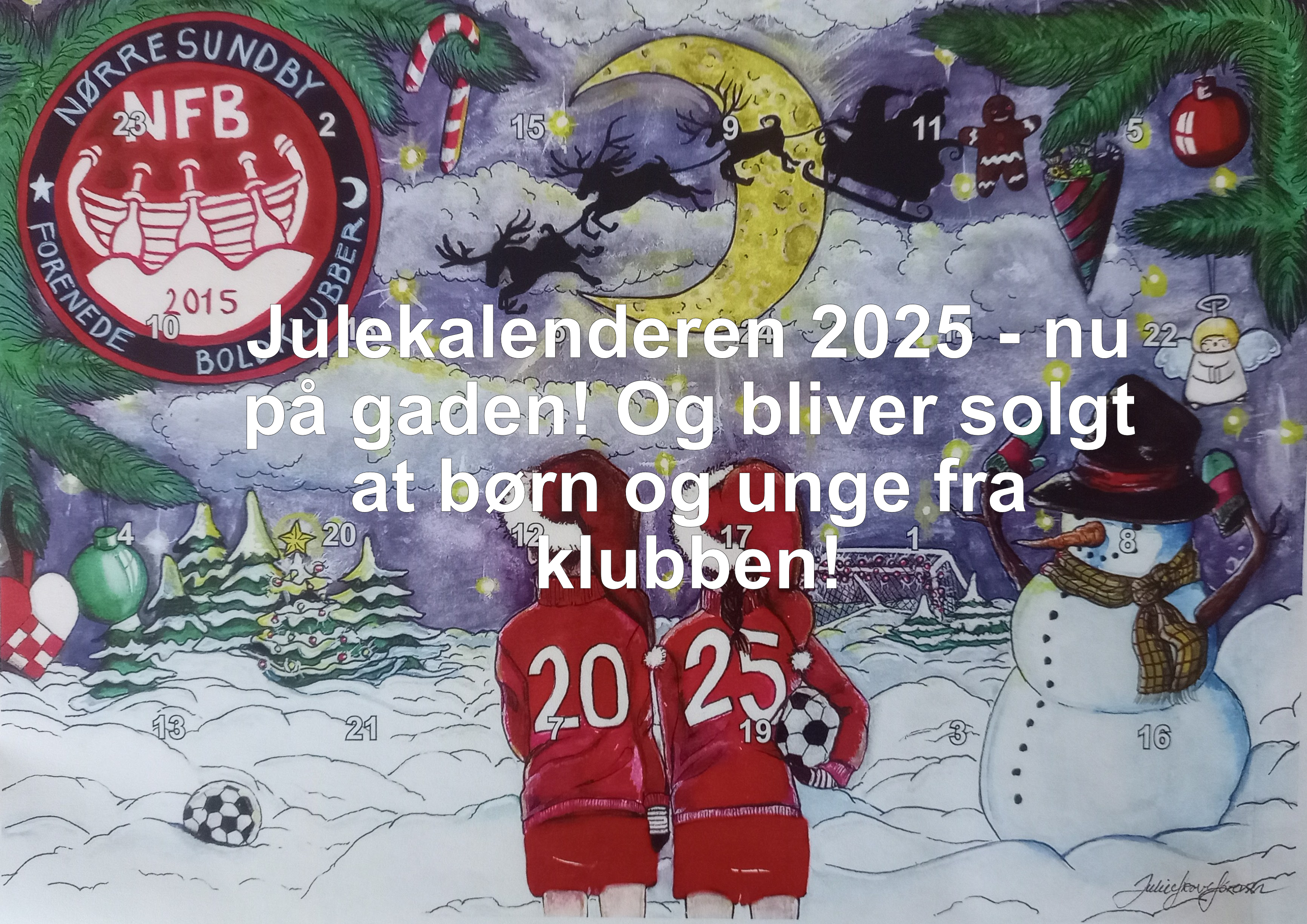 I november møder du en masse af børn og unge fra Nørresundby Forenede Boldklubber der vil sælge dig en julekalender - Årets Julekalender. Julekalenderen koster kr. 40,-. Julie har frihånd tegnet en speciel forside til Nørresundby FB’s julekalender 2025. Et dejligt nyt frisk NFB-indtryk og gør kalenderen til en ”speciel” Nørresundby FB-julekalender. Samtidig er præmierne på kalender sat op.